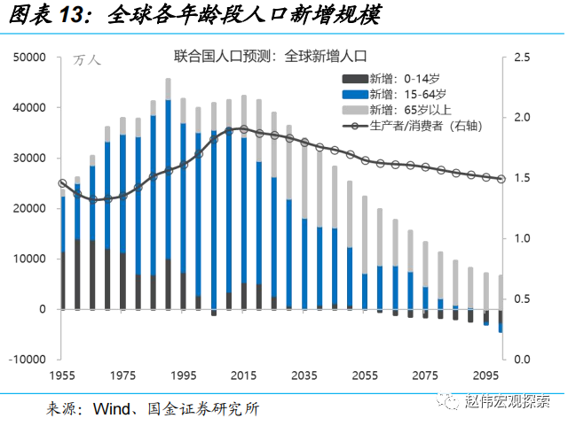 2010年是美国“人口红利”(生产者/消费者比例)的顶点。从2011年开始,战后“婴儿潮”时代(1946年至1964)出生7,600万人就已经陆陆续续地进入老龄化阶段,这一个过程将持续到2029年(持续18年)。曾经,中国的“人口红利”就是全球的“人口红利”,但中国人口时代红利渐行渐远。并且,劳动供给问题已不再是美国或中国的问题,而是全球性问题。因为2015年是全球“人口红利”的峰值。美国劳动力短缺是个中期约束,劳动工资涨幅短期内难以回到疫情前的平均水平(3-4%)。