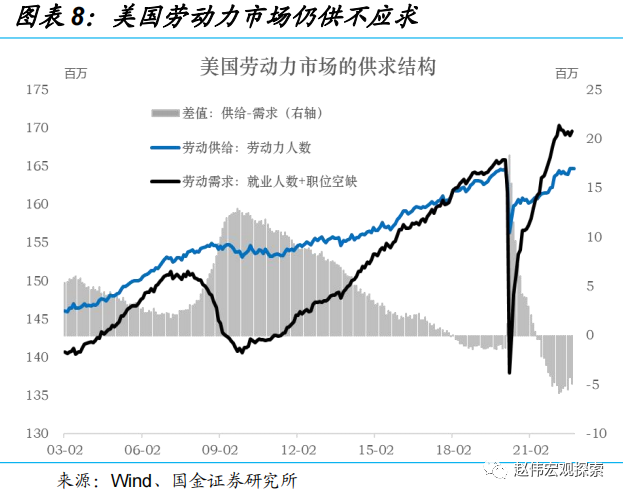 美国至今仍有近500万劳动力缺口,较3月的峰值下降了100万。每个失业者对应的空缺岗位数仍高达1.6-1.7,低于峰值(2),但高于疫情之前的水平(1.2)。并且,劳动缺口具有长期性。一方面,受疫情影响,美国提前退休人数增加了近200万,导致劳动参与率比疫情前低0.8个百分点。受特朗普政府移民政策的影响,2017年来累计减少的移民人数约300万。