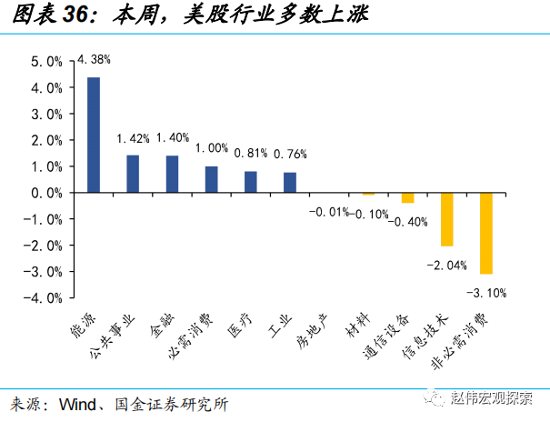 美国及欧元区各行业多数上涨。从美国标普500的行业涨幅来看,本周美股行业多数上涨。其中能源、公共事业、金融、必需消费、医疗、工业领涨,分别上涨4.38%、1.42%、1.40%、1.00%、0.81%和0.76%。从欧元区行业板块来看,本周欧元区行业多数上涨。其中非必需消费、医疗保健、必需消费、公用事业和科技领涨,分别上涨2.94%、1.18%、0.83%、0.54%和0.36%;工业持平。