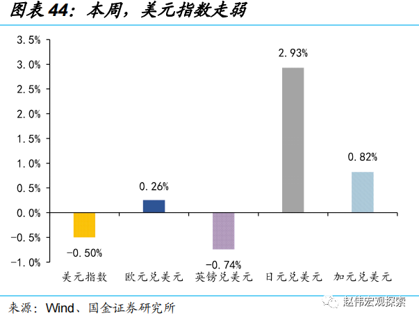 美元兑人民币贬值2.02%。欧元、英镑兑人民币分别贬值0.93%、0.55%,日元兑人民币升值1.87%。美元兑在岸人民币汇率较上周环比下行1760bp至6.9880,美元兑离岸人民币汇率下行1679bp至7.0256。