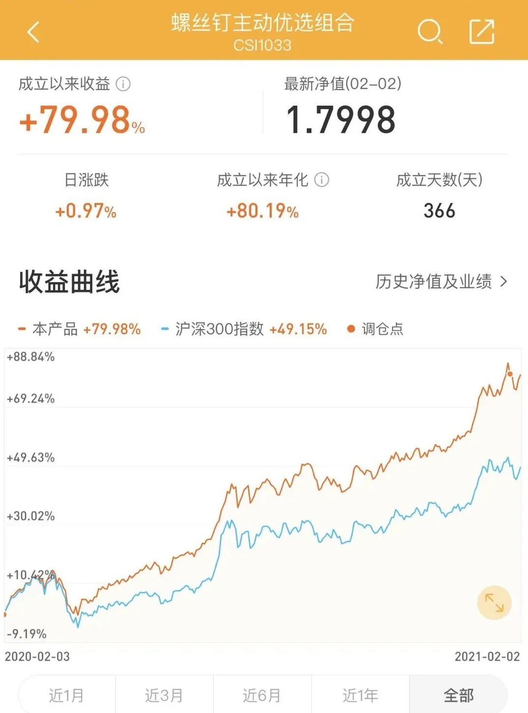 过去1年时间,螺丝钉主动优选组合的两个重要指标,截止到2021年2月2日收盘