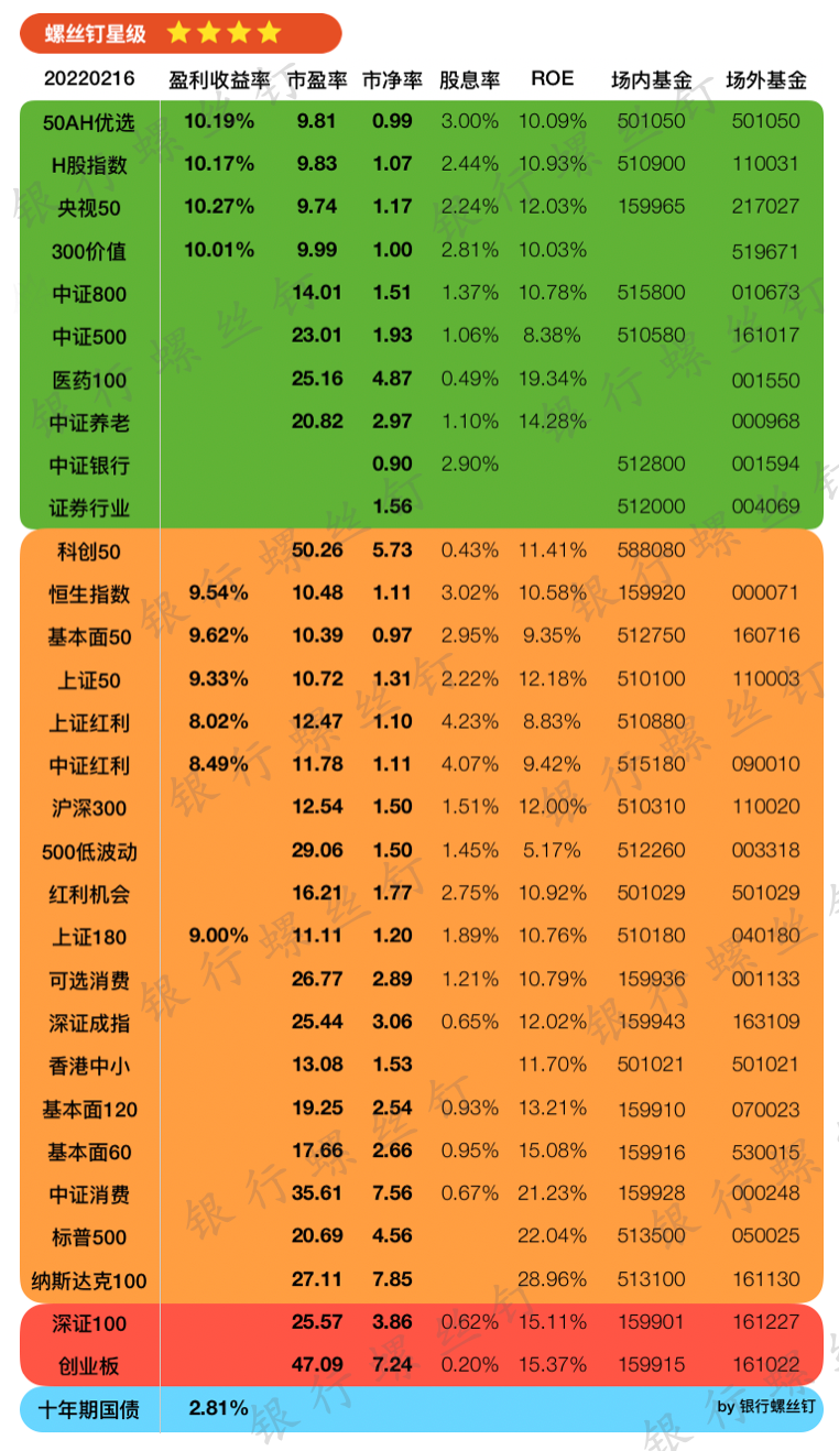 a. 表格中绿色品种为低估适合定投的品种,黄色为正常可以暂停定投继续持有,红色为高估,蓝色为债券类参考资料。