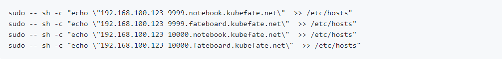 sudo -- sh -c "echo \"192.168.100.123 kubefate.net\" >> /etc/hosts"