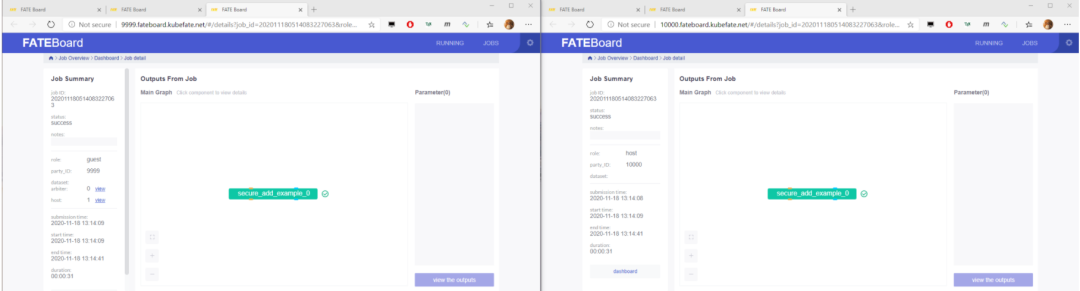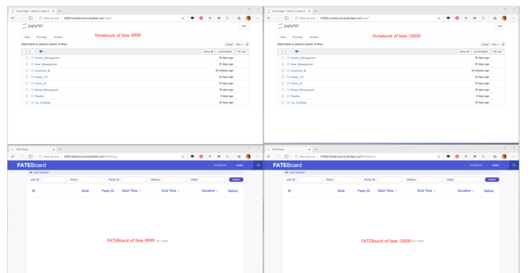 如果一切顺利,我们可以通过浏览器访问fate-9999和fate-10000各自的Jupyter Notebook 与 FATEBoard,共 4 个 Dashboards,