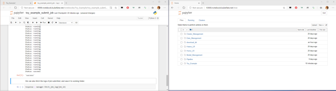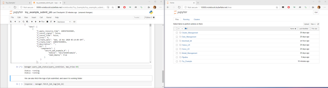 我们点击FATEBoard of fate-9999和FATEBoard of fate-10000中RUNNING 菜单,以观察任务的状态。然后在Notebook of FATE-9999中选择进入Toy_Example目录,我们可以看到toy_example_submit_job.ipynb. ipynb是Jupyter Notebook的文件格式,具体可参考:https://jupyter-notebook.readthedocs.io/en/stable/