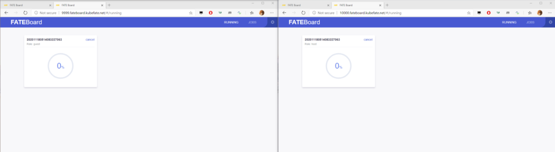 在我们执行到第五个代码块时,我们可以看到fate-9999与fate-10000的FATEBoard会各产生一个正在执行的任务。