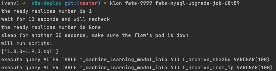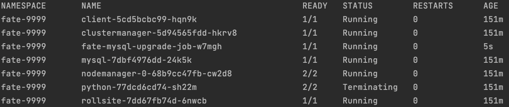这表示升级到v1.9.0已经成功了,且在v1.8.0时代产生的所有持久化数据都已经成功地挂载到了v1.9.0的FATE的各个pod上。