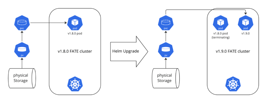 FATE集群是由多个pod组成的,其中一部分pod需要挂载持久化卷,即pv,来存储化一些生产数据。当我们选择使用existingClaim方式挂载持久化卷时,这些持久化的数据是不在Helm的管辖范围之内的。因此当KubeFATE操纵Helm来摧毁v1.8.0版本的资源时(pod,service,ingress)等,这些pv/pvc可以被保留。又因为我们在v1.9.0的版本中继续指定这些pv/pvc作为existingClaim。因此下个版本的pod在启动时会直接挂载这些存储卷。从用户的角度来看就是FATE升级了,且以前老数据还在的效果。