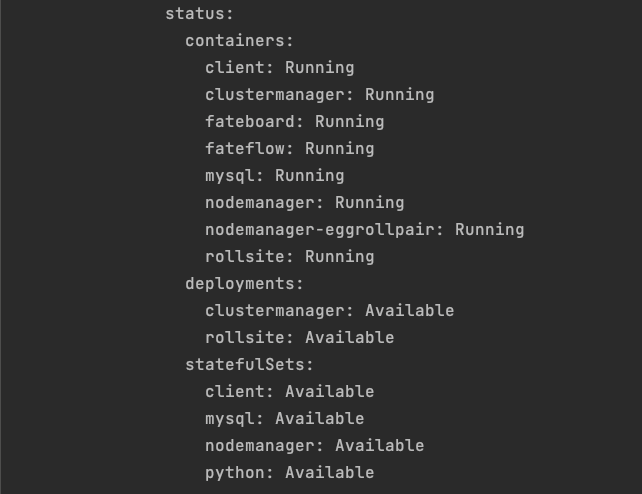 可以看到v1.9.0 FATE集群的pod,deployment和statefulSets均处于就绪状态。(注:在v1.9.0版本中我们将所有需要数据持久化的FATE组件改为了更为合适的StatefulSets形式,https://github.com/FederatedAI/KubeFATE/pull/681)