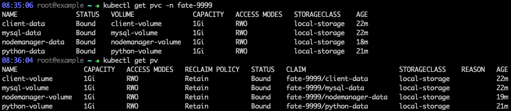 这四个pv/pvc分别是给FATE集群的四个模块:Jupyter notebook(client),MySQL,fateflow(python)和eggroll(nodemanager)准备的。