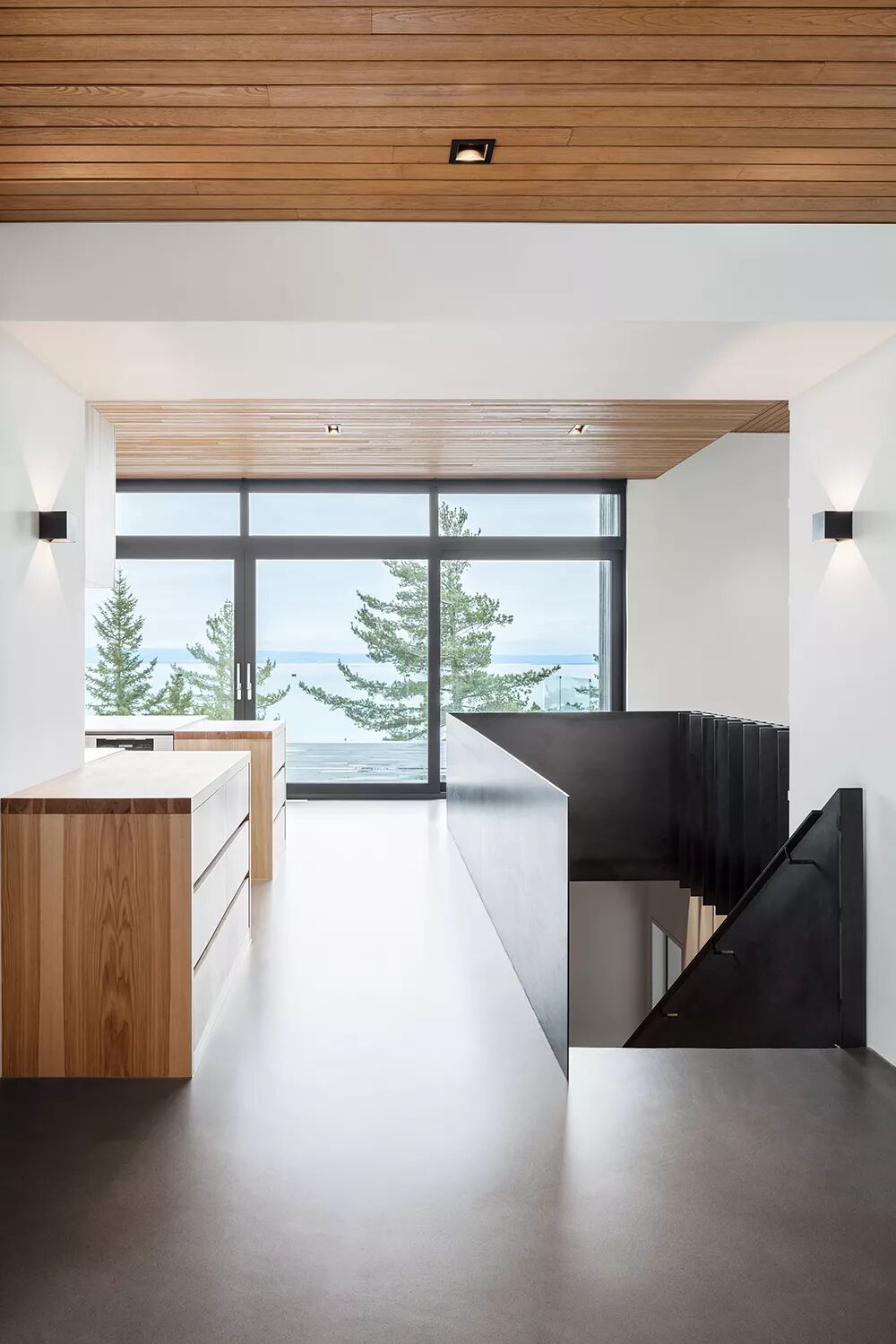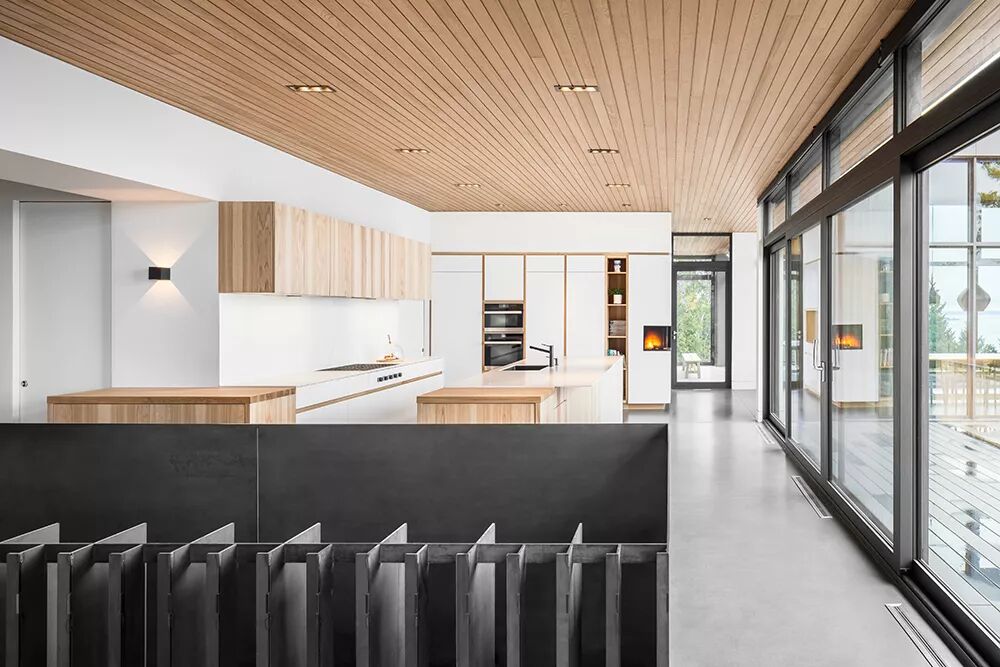 LF:这次的设计概念是希望从房间里看出去,能够直接欣赏到不同的风景,比如滑雪场和l’Isle-aux-Coudres岛;因此我们把整栋房子分成了几个主体,并在每个主体间创建了一种联系,防止它们互相遮挡视野。同时,为了让每个房间更具个性,我们引入了不同的天花板高度,创造出不同的氛围。