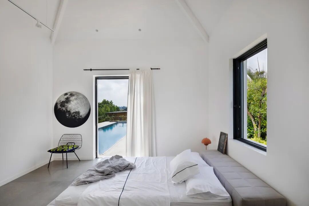 ▲以白色为主色调的卧室,联通窗外满眼绿意。