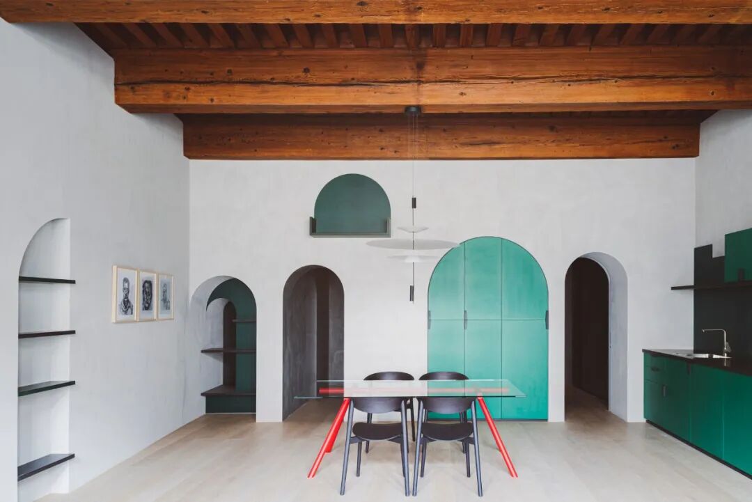 ▲餐桌腿的一抹红色形成鲜明的点缀