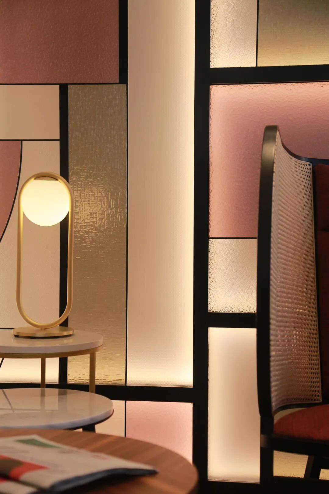 设计师团队在酒店门厅处添加了大量的几何图形元素。正方形、长方形、圆形在面积不大的门厅处交相辉映,试图唤醒酒店深处沉淀着的丝绸记忆。