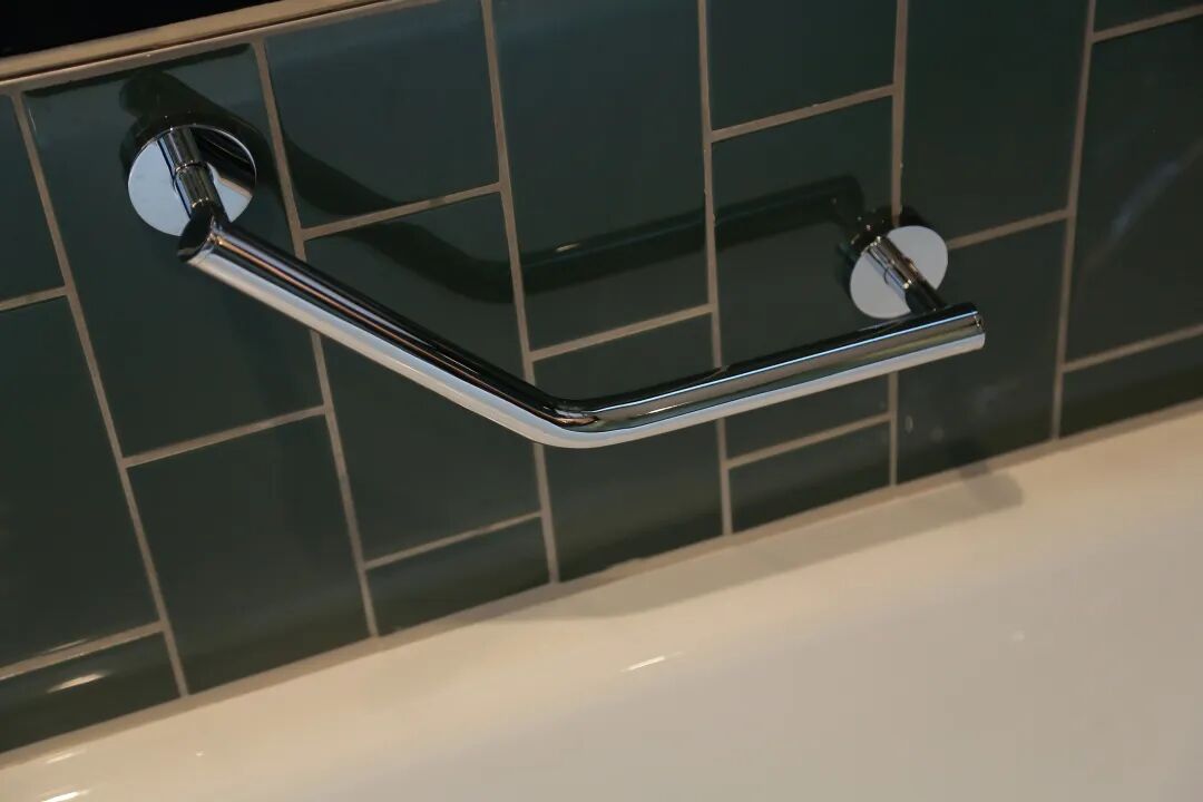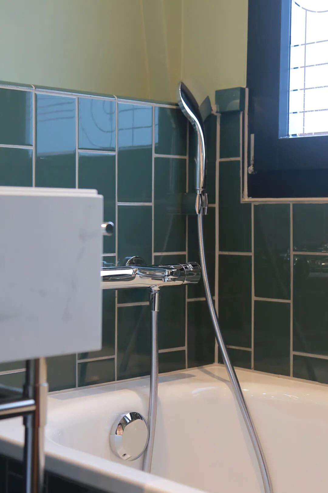 △灰绿色的浴室、光泽饱满的瓷砖