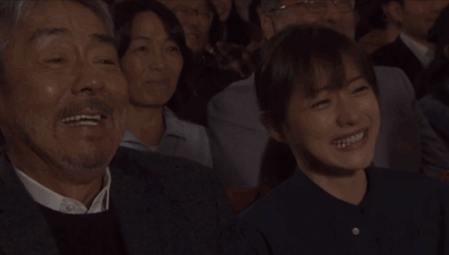 最后一天,父女两人去看落语表演。周围的观众都被逗得哈哈大笑,父女两人非常努力地想要配合表演笑起来,但嘴角咧开的瞬间眼泪却不由自主地往下流。