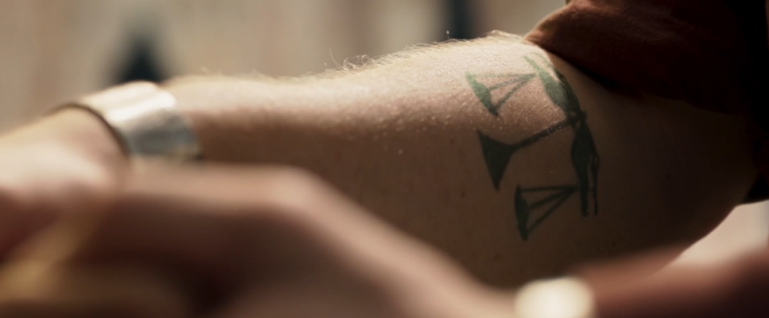 故事开头,一个男人将喝完水的玻璃杯打碎,倒在鞋里,忍受疼痛踩在上面,右手执杖,手臂上还有天平刺青。