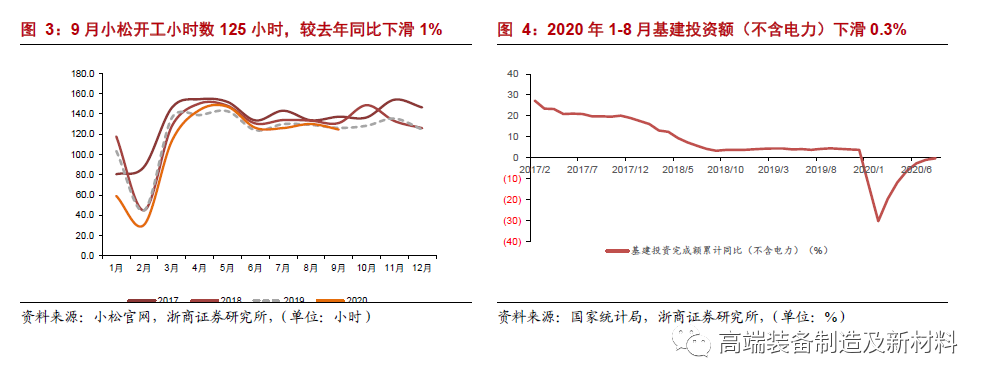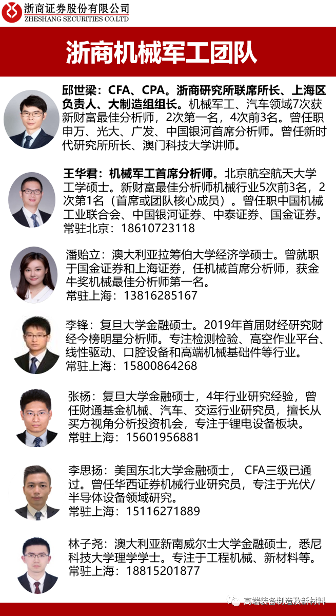 投资要点 9月挖机销量持续高增长,同比增长65%,再超市场预期 8月同比增速为51%,9月份增速为65%,单月同比增速加快14个百分点;1-8月份同比增长为29%,1-9月份增长为32%,累计增速加快3个百分点。 下游基建、地产投资持续高景气度 2020年4-8月房地产投资额累计同比增速分别为-3%、-0.3%、2%、3%、5%,当月同比增速分别为7%、8%、9%、11.7%、11.8%,逐月改善。 2020年4-8月地产新开工面积累计增速为-18%、-13%、-8%、-5%、-4%,当月增速分别为-1%、3%、9%、11%、2%,逐月改善。 2020年4-8月份,基建投资额(不含电力)累计投资增速为-12%、-6%、-3%、-1%、-0.3%,当月同比增速分别是2%、8%、7%、8%、4%,连续5个月保持正增速。 9月中挖同比增长106%,增速超预期;小挖销量维持较高增速 1-9月国内大、中、小挖分别累计销售约为2.8万台、4.1万台、9.6万台,同比增长分别23%、34%、35%;其中9月单月大、中、小挖分别销售0.3万台、0.6万台、1.3万台,同比增长分别为53%、106%、63%。9月国内大、中、小挖销量分别占比14%、28%、58%,与8月比,大挖占比下滑0.2个百分点,小挖提升2.1个百分点。 挖掘机头部品牌集中度延续,三一重工9月单月市占率近29% 挖掘机头部品牌高集中度延续,我们测算1-9月前6大企业市占率合计约75%,较2019年全年提升1.5个百分点,9月单月前6大企业市占率合计76%,较2019年全年增长2.6个百分点,龙头效应趋势明显。我们判断1-9月挖掘机国内市场份额前三分别为三一重工(26%)、徐工机械(16%)、卡特彼勒(11%),其中三一重工市占率在9月单月期间接近29%,延续8月高市占率,较2019年全年提升近3个百分点,未来市占率有望持续提升。 预计四季度仍保持高增长,全年行业销量增速有望超30% 地产基建投资持续复苏,人工替代、环保及更换需求,挖掘机较高景气度有望延续。我们预计2020全年挖机销量将超31万台,同比增长超30%;龙头公司市占率将持续提升。 投资建议 工程机械中持续推荐挖掘机产业链龙头。持续重点推荐:三一重工(浙商十月金股)、建设机械、浙江鼎力、中联重科;看好恒立液压、徐工机械、艾迪精密。 风险提示:基建、地产投资不及预期;海外、国内新冠疫情超预期风险。 |