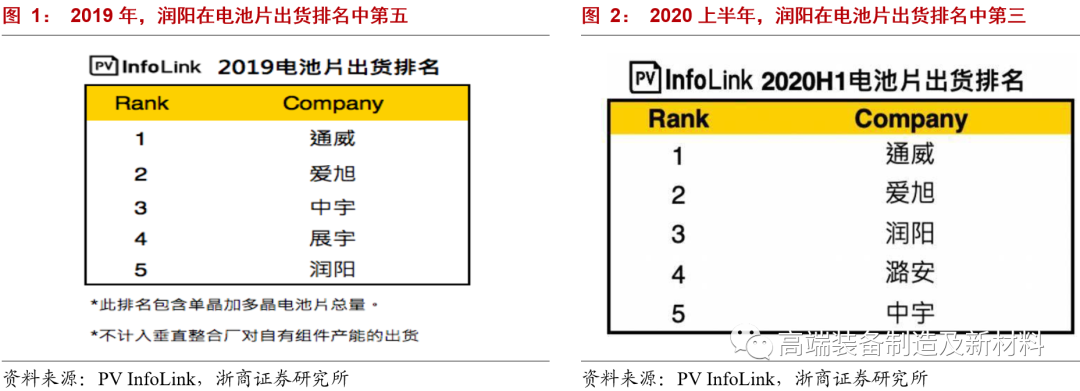 附录1:江苏润阳新能源成立于2013年,专业从事太阳能电池的研发、制造和应用。目前拥有盐城基地6.5GW单晶PERC产能,和建湖基地5.5GW单晶PERC产能。其二期项目规划13.5GW电池片产能,预计于2021年开工建设。据PV Infolink调研,公司在2019年电池片出货量排名第5,2020年上半年出货量排名第3,上升势头明显。