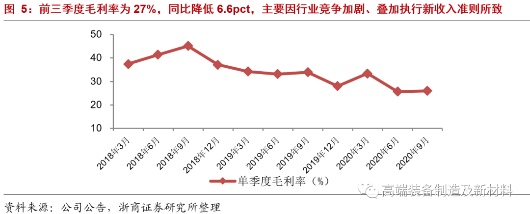 附录4:前三季度毛利率为27%,同比降低6.6pct。其中单Q3毛利率达26%,同比减少7.9pct。毛利率下滑主要因行业竞争加剧、叠加执行新收入准则所致(场外安装调试费用由销售费用调整至营业成本)。