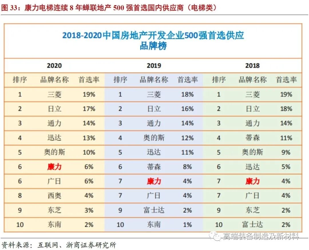 公司持续渗透国内一线地产商项目。随着自主电梯企业的崛起,更多一线地产公司开始积极接受自主电梯品牌。公司通过多种渠道与核心地产商建立联系,例如投资蓝光嘉宝物业,投资保利碧桂园合资基金,力求与大型地产商建立长期、常态、稳定化的合作关系。公司连续8年蝉联中国房地产500强国内企业首选供应名单(电梯类),2020年首选率提升至6%,市场认可度有所提高。凭借渠道运营灵活性优势,未来公司在一线地产商的项目中渗透率有望进一步提升,驱动规模持续增长。