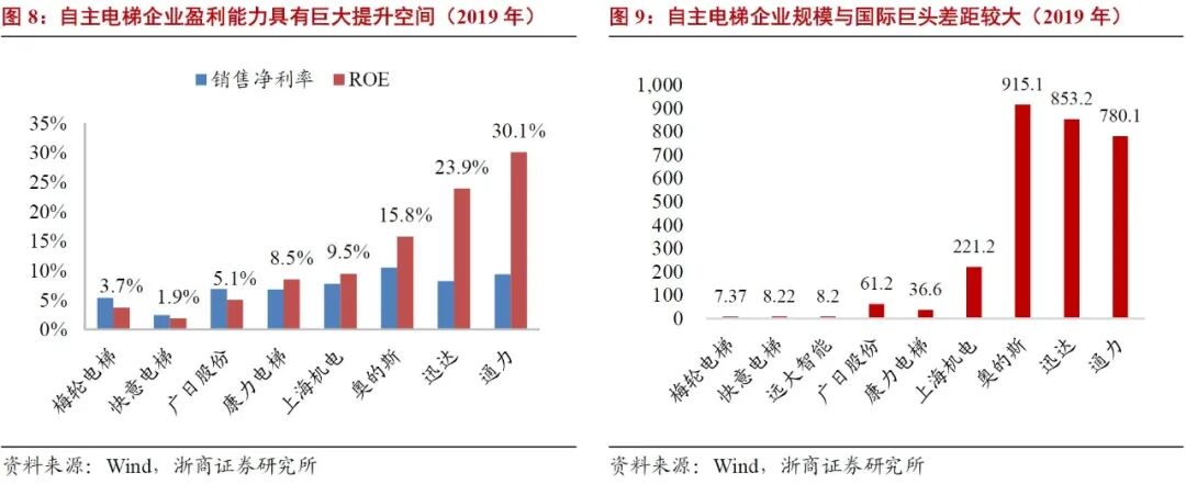 公司发展潜力巨大。公司的成长潜力可以外资品牌在国内的表现作为参照。从规模来看,外资品牌通力、三菱、日立在国内的销售额分别约220亿元、200亿元、180亿元,远高于公司的37亿,三家国内市场合计占比超30%;从盈利水平来看,通力迅达在国内市场的净利率约20%,而2019年公司净利率仅为7%。因此公司在规模及盈利能力方面存在较大提升空间,发展潜力巨大。