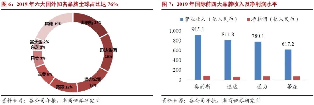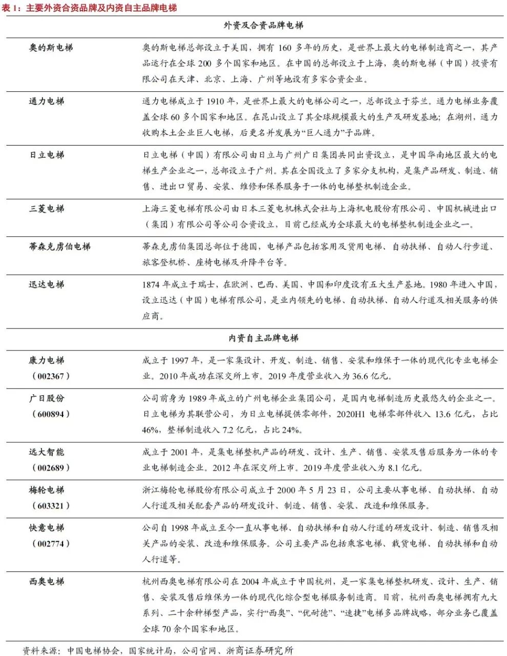 六大巨头瓜分国际市场,国内自主品牌快速崛起。国际电梯知名品牌的主要代表有美国奥的斯、瑞士迅达、德国蒂森克虏伯、芬兰通力、日本三菱和日立等六大品牌,2019年占全球市场份额比重高达76%,且均已在中国设有合资公司或全资子公司。内资自主品牌有康力、广日、西奥等。目前外资品牌在国内市场仍占有较大份额,但自主品牌崛起势头强劲,中长期有望实现赶超。