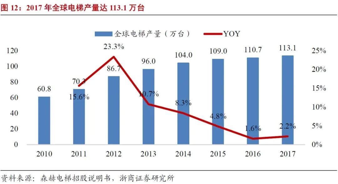 近年来,全球电梯产量保持增长,从2010年的61万台增至2017年的113万台,年均复合增长率达9.3%。