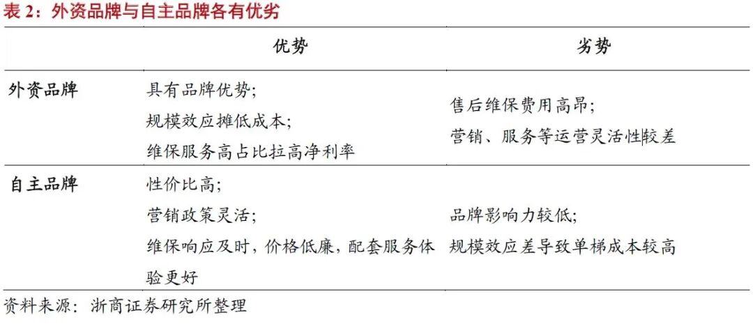 内外资品牌各有优劣,国内行业格局加速优化。在中国市场,外资品牌逐渐分化:通力销量巨大,盈利能力强,在国内市场遥遥领先;其次为日立、三菱;奥的斯、迅达、蒂森的客户管理精细程度相对通力和日立较差,排名逐渐落后。自主品牌康力、广日、西奥凭借高性价比及营销政策灵活等优势,市场份额均有所提升,但品牌方面仍是劣势,随市占率不断提高,将打破现有竞争局面,国内行业格局将加速优化。