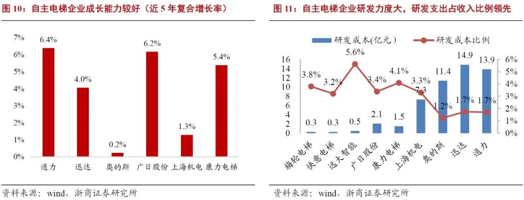 自主品牌更具成长空间。与国际电梯巨头相比,自主企业规模差距明显,净资产收益率较为落后,发展空间巨大。自主品牌尚处于快速发展阶段,康力电梯、广日股份近5年的年均复合增长率均超过5%;研发支出占营业收入比例均超过3%,技术赶超叠加国内市场繁荣,外资企业在维保期后维修价格贵、不及时等缺点将成为赶超突破口,品牌口碑和认可度将快速提高,自主品牌有望迎来历史发展机遇。