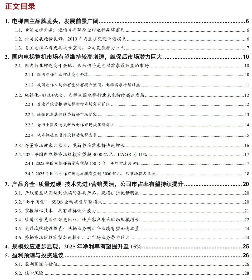 综上所述,公司作为国内自主电梯品牌龙头,目前发展势头良好,未来成长潜力巨大。下文将具体从行业规模、公司市占率及盈利水平三个维度来阐述公司潜力兑现的基本路径。