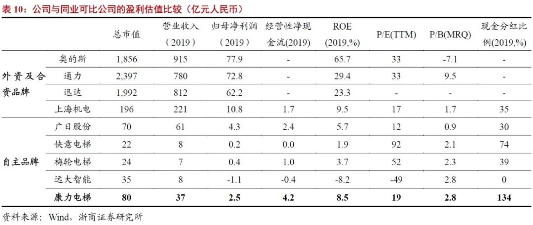 我国电梯行业增速高于全球,已成为全球电梯保有量最大的国家。公司在国内自主品牌中名列前茅,规模远超第二名内资电梯企业,但2019年收入规模仍远低于国际龙头,不足其5%,ROE水平与外资品牌存在较大差距,但为自主品牌最高。2019年公司现金分红比例高达134%,为行业最高,主要得益于公司现金流表现较好,经营性净现金流达归母净利润的1.7倍。