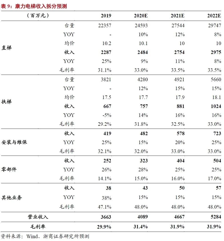 1)将公司业务拆分为直梯、扶梯、安装与维保、零部件、其他业务。直梯、扶梯整梯为主要业务,重点进行量价拆分预测,其余业务给予增速判断。
