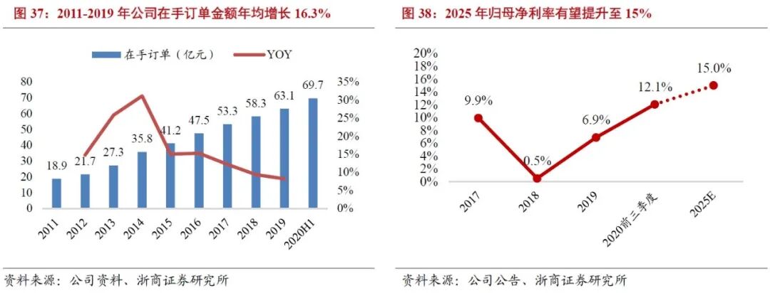 公司在手订单金额持续增长,净利率大幅提升。2011-2019年公司在手订单金额年均增长16.3%。截至2020年上半年,公司正在执行的有效订单为69.7亿元(包括中标但未收到定金的6.22亿元订单),相比2019年年底增长10.5%。2019年公司归母净利率仅为7%,随着订单量持续增多,规模效应凸显,2020年前三季度归母净利率大幅提升至12%。