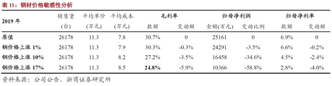 公司业务中,成本与钢材相关性较强的为电扶梯整体业务以及零部件业务,由于零部件业务占比较小,在此主要考虑钢材价格对整梯业务毛利率的影响。整梯业务中原材料占到营业成本比例约90%,原材料含钢比约为50%-60%,因此我们假设整梯50%的营业成本与钢材价格走势相关。以2019年公司经营数据为基准进行分析可以得出,钢材价格每上涨1%,整梯业务毛利率下降0.3pct,公司归母净利率下降0.2pct。当钢材价格上涨幅度超过17%时,整梯业务毛利率降至25%以下,将对公司经营产生较大影响。