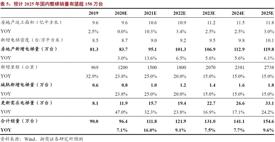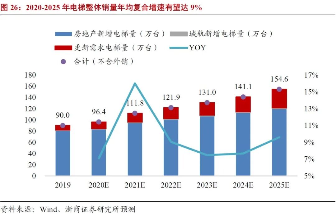 根据预测,受房地产市场及更新替换需求拉动,2025年国内电梯整梯销量有望超150万台,年均增速可达9%。