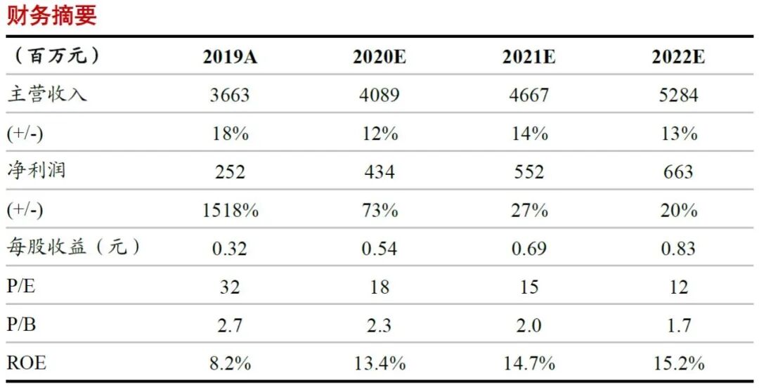 我们预计公司2020~2022年收入分别为41、47、53亿元,同比增长12%、14%、13%;归母净利润分别为4.3、5.5、6.6亿元,同比增长73%、27%、20%;EPS为0.54/0.69/0.83元,对应PE为18/15/12倍。