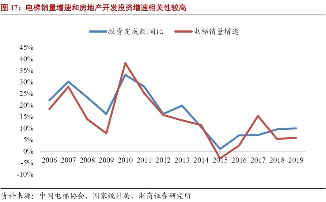 电梯销量增速与房地产开发投资增速具有较强的相关性。受宏观因素影响,2015-2017年我国房地产行业处于调整阶段,投资增速分别为1.0%、6.9%、7.0%,处于较低位置,新开工房屋面积较2014年并未增长。2018-2019年地产投资增速回暖至9.5%、9.9%,新开工房屋面积恢复至2013年水平以上。本轮地产周期房屋竣工面积增长滞后于新开工面积三年,在2018年达到拐点,未来三年竣工面积将保持增长。长期来看,房地产市场有望持续健康发展,保持稳定增速,为电梯新增市场需求的持续扩张提供动力。
