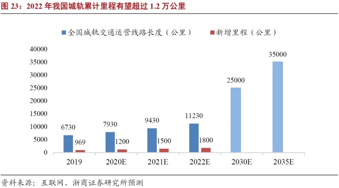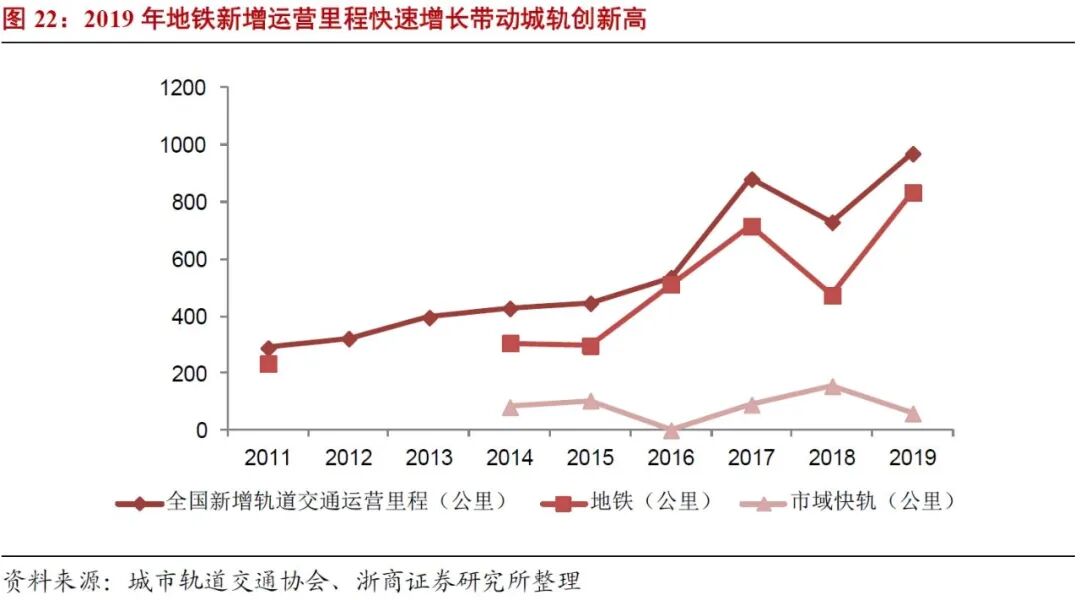 未来两年将迎来城轨建设高峰期。截至2019年末,我国城市轨道运营总里程达6,730.3公里。2019年我国完成新增城市轨道交通投资9700亿元,同比增长77.3%;新增运营线路约969公里,其中新增地铁运营里程832.72公里,同比增长76.2%。根据我们的不完全统计,2018年8月到2019年国家发改委共批复1764.6公里城市轨道交通计划,预计未来1-2年将迎来城轨建设高峰期。