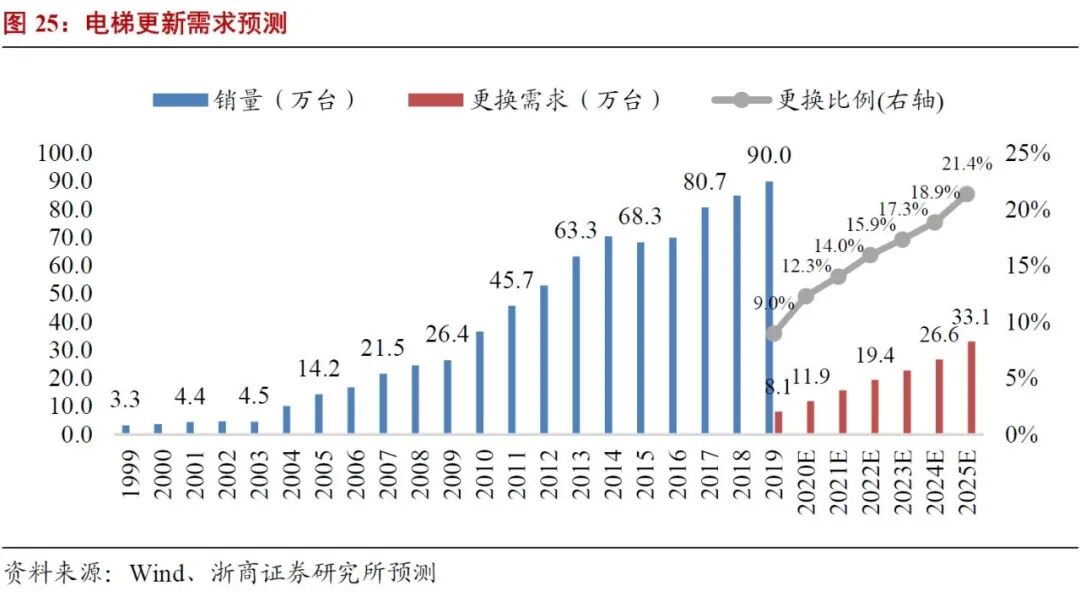 国内电梯更新规模加速扩张,成为行业增长新动力。2019年电梯更新量为8万台,更换占新梯总量比约为9%。假设电梯设备使用年数为14年、15年、16年、17年的比例分别为15%、40%、30%、15%,可推测算出2025年电梯更新需求市场规模将超过30万台,更换占比超20%。预计未来电梯更换市场规模将加速增长,更换比例将持续提升。