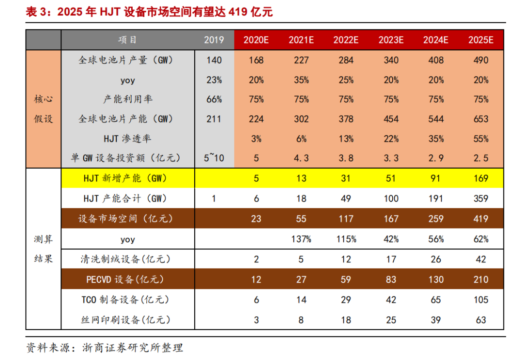 附录3:预计2025年HJT设备市场空间有望达419亿元,2020-2025年CAGR达80%,其中PECVD设备规模达210亿元,HJT市场将迎来爆发式增长。