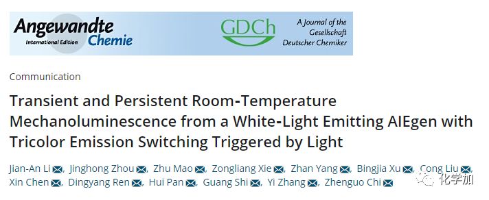 近日,华南师范大学化学与环境学院大学生创新创业训练计划小组成员2015级本科生黎建桉和周京弘同学以共同第一作者的身份,在国际化学领域顶级学术期刊《Angew. Chem. Int. Ed.》(SCI IF=11.99)上发表题为“Transient and Persistent Room‐Temperature Mechanoluminescence from a White‐Light Emitting AIEgen with Tricolor Emission Switching Triggered by Light”的学术论文。 文章DOI: 10.1002/anie.201800762