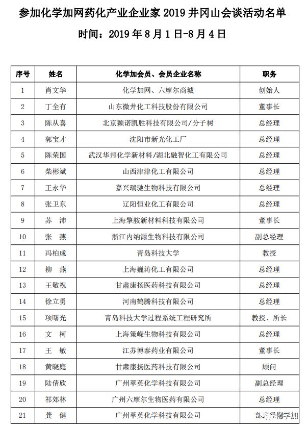 弘扬井冈山精神,勇于创业创新,合作发展。8月1日-4日,化学加网“药化产业企业家2019井冈山会谈”活动在江西井冈山成功举办,20余位药化产业企业家、产学研教授参加了这次活动。