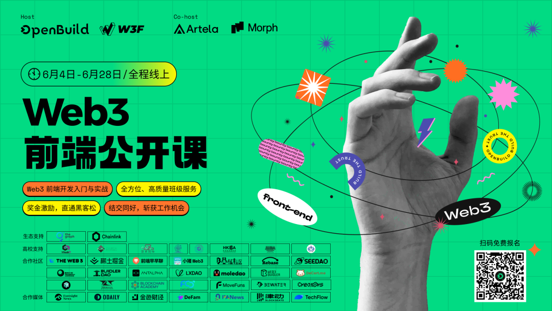 为了帮助更多开发者丝滑进入 Web3 行业, W3F 和 OpenBuild 发起了为期 4 周的 「Web3前端训练营」、 Artela 、Morph 共同主办,并获得 theGraph 和 Chainlink 生态支持。