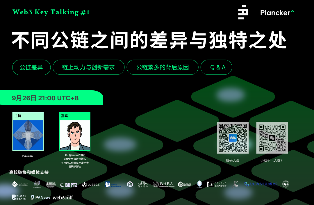 浙大链协支持:Web3 Key Talking #1 第一期 不同公链之间的差异与独特之处来了 时间: 9 月 26 日(周四)21:00-22:00(UTC+8)