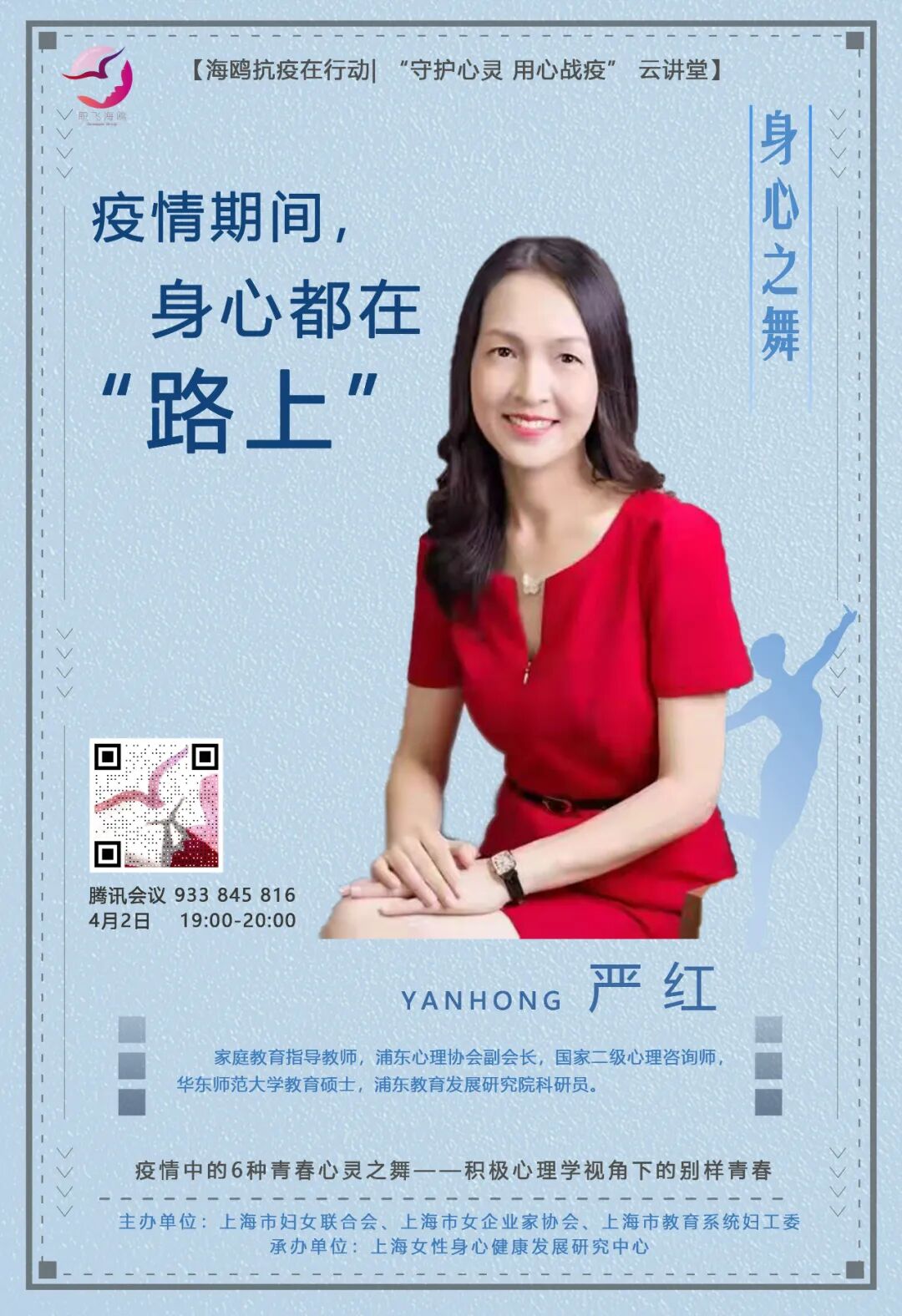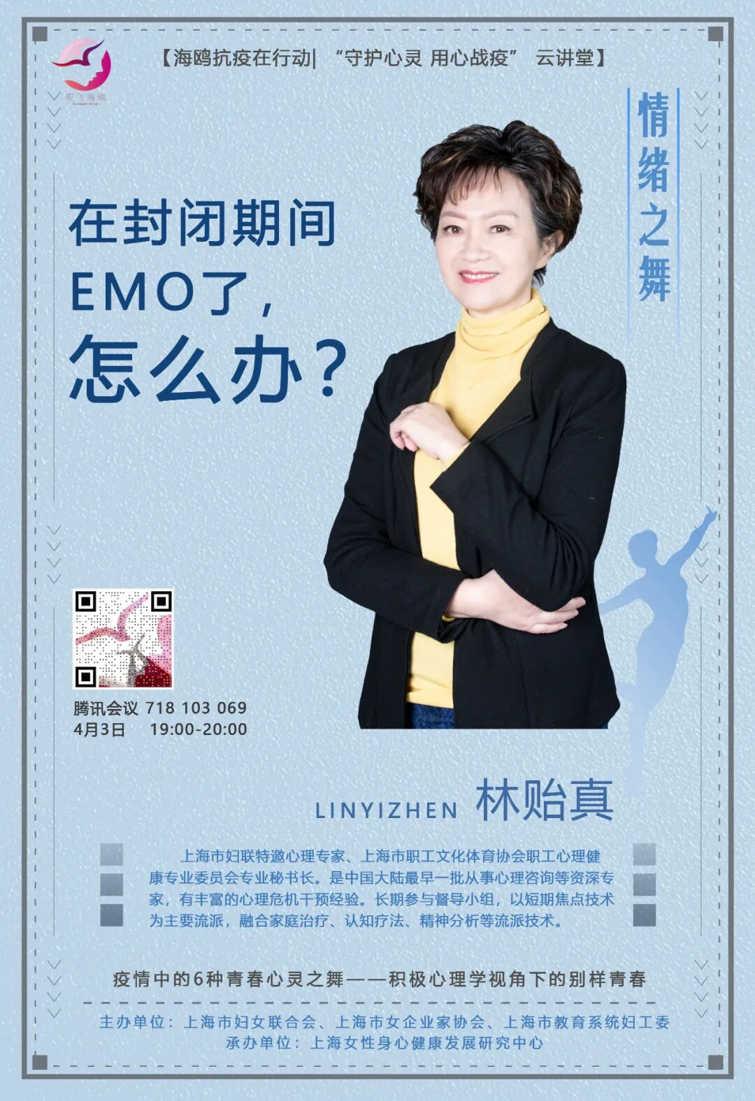 “海鸥讲堂”致力于为女大学生们提供积极的自我成长帮助。基于疫情反复带来的新状况,3月30日—4月4日每晚19:00-20:00,共策划了六场“青春心灵之舞”课程,从学习、变奏、生活、身心、情绪、创造这六个方面入手,关爱女大学生们的心理状况、挖掘她们在疫情隔离期间的成长潜力。