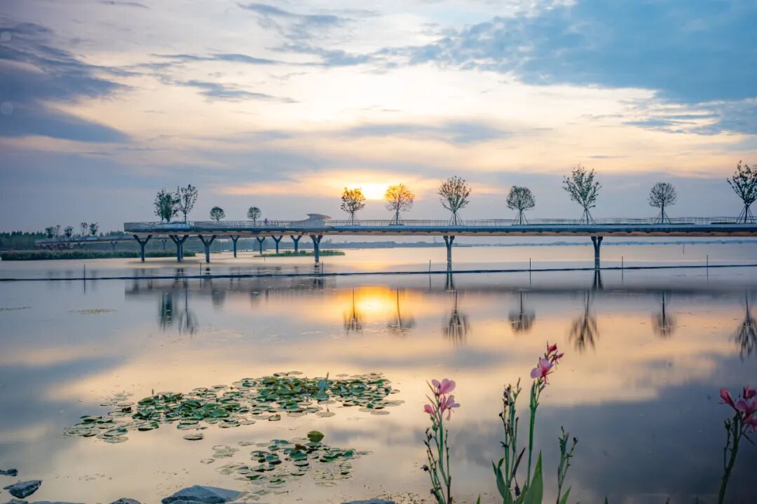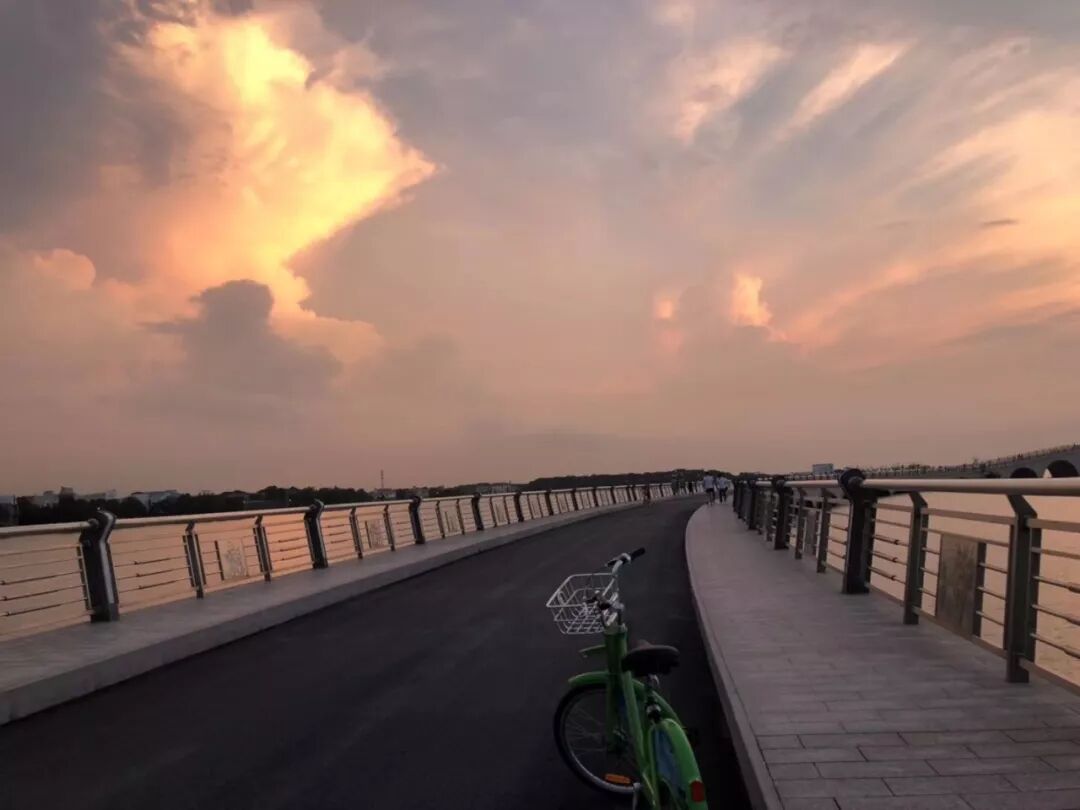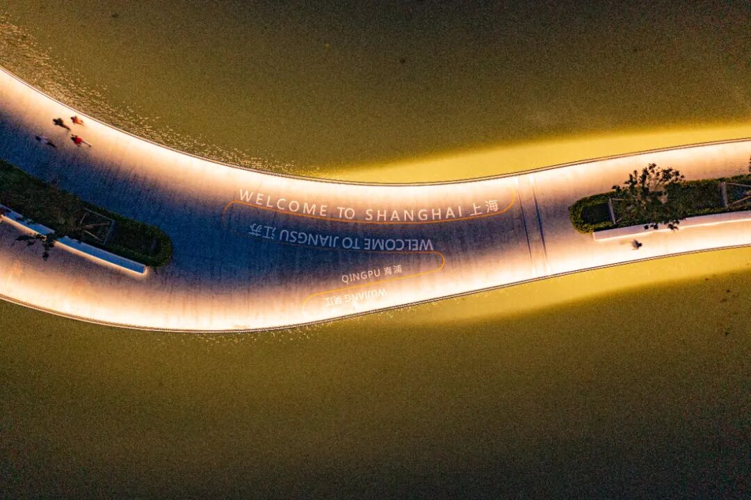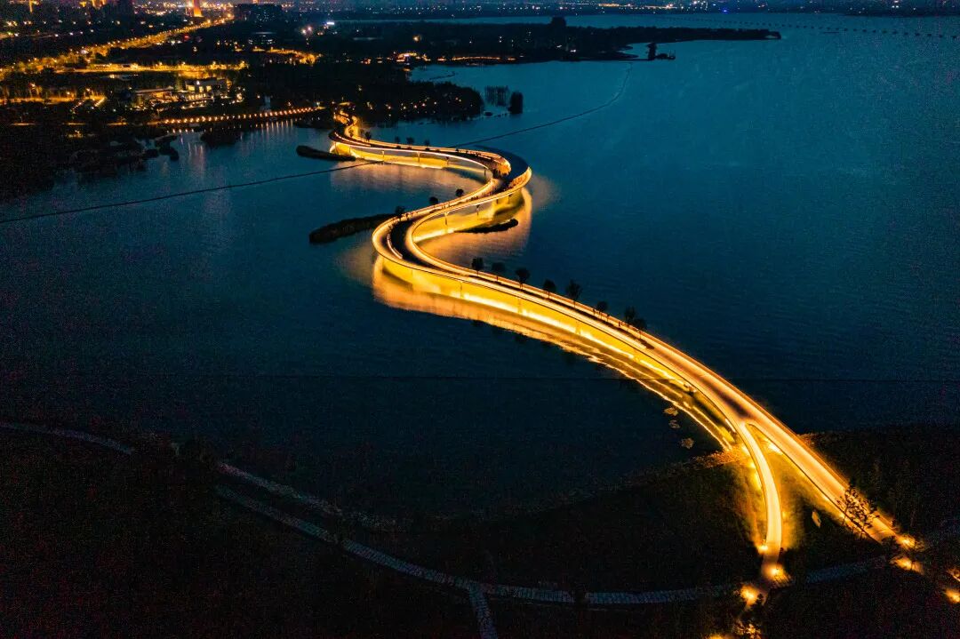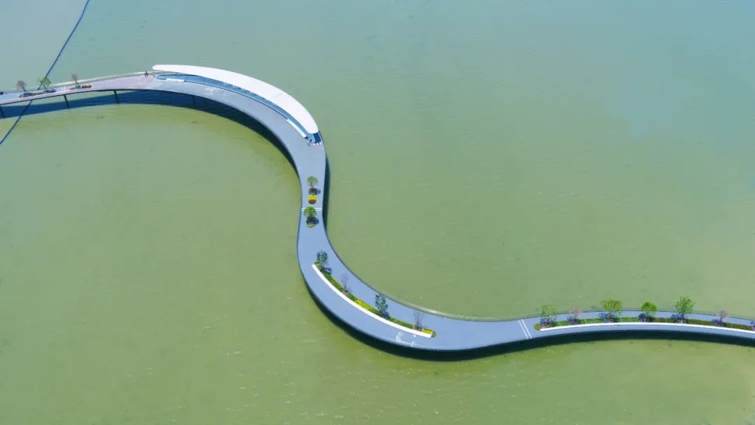 一座宛如缎带的慢行桥飞卧在元荡湖上。