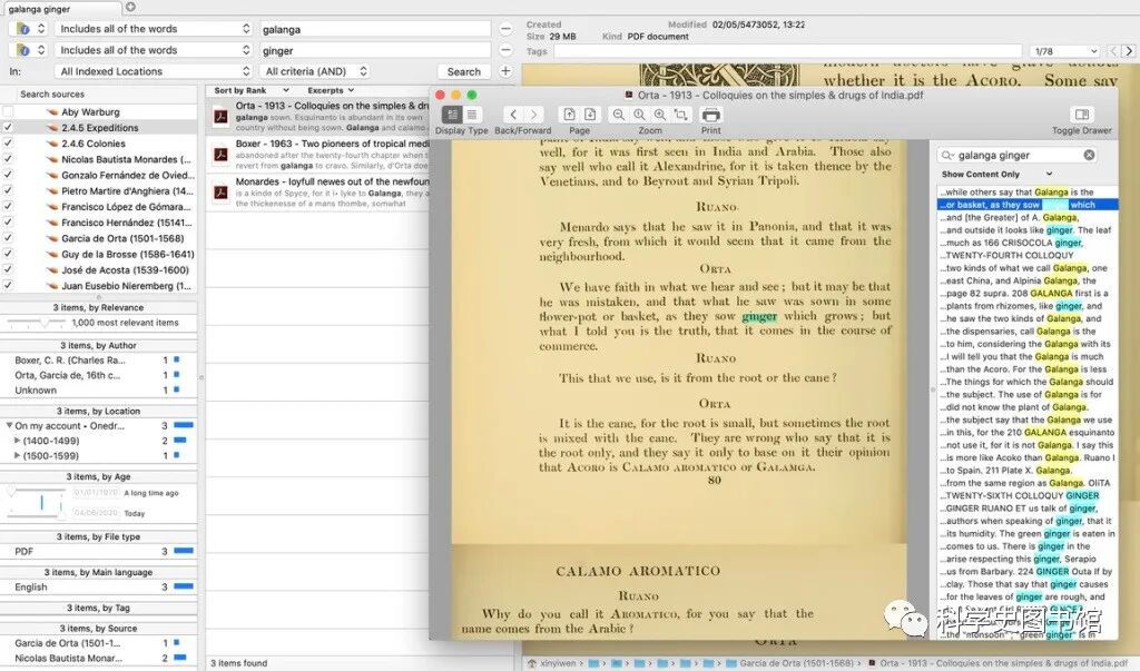 我收藏这么多作者当然不是闲得没事干,使用Foxtrot Pro我可以为他们每一个人建立全文索引。一手文献方面,我有各大early modern数据库如EEB提供的电子化的印刷本,只要买了数据库全都可以下载,你双击图书馆里的条目就可以自动跳转过去。二手文献方面,关于这些作者的论文和书基本也能找到电子版,毕竟整个early modern医学和博物学文献的增多就是在近几十年内,多数东西都电子化了。因此对于这里的每一个作者,我都有一个Foxtrot Pro的全文索引,想搜索他们哪一个人写了什么植物、矿物,提到了什么哲学概念,或者哪几个人有没有互相引用彼此对某一事物的描述,都可以在下图的数据库中搜索。