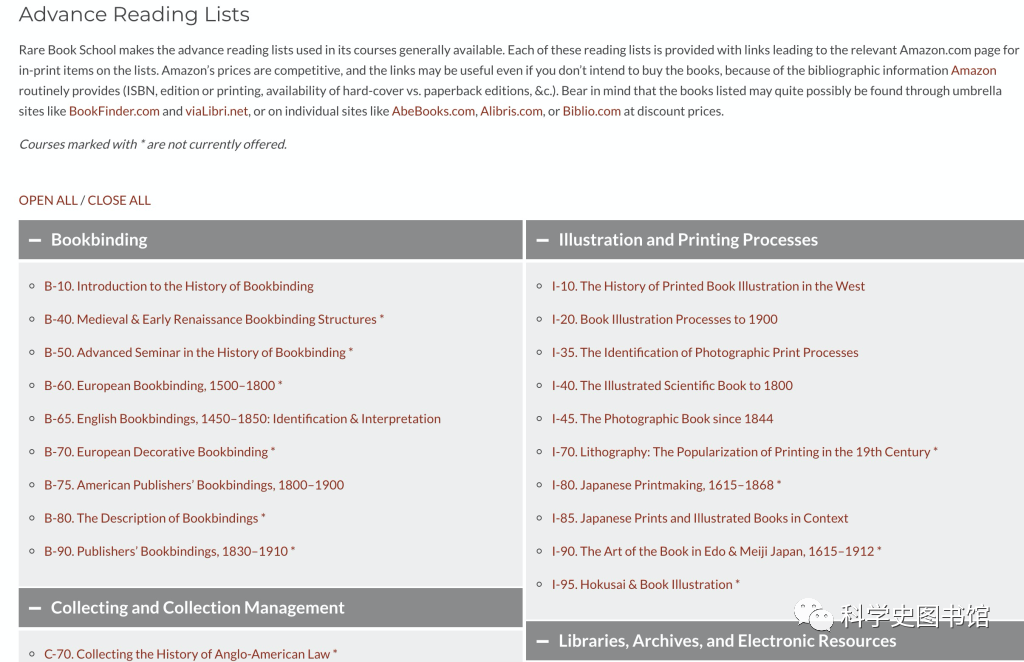 书籍史这个领域好的导论很多,我在0 Books in General收入了系里的research guide和我上过课的London Rare Book School的推荐书单,他们的网页最近有改版,改版后把以往开过的所有课的书单都放了上来(如下图),浏览一下可以知道这个领域都包括哪些东西。和我对图像科学的关注点一样,我在这里主要关注的是书籍信息的组织方式,这主要体现在 1 Libraries 图书馆和 2 Bibliographies 书目两个载体里。