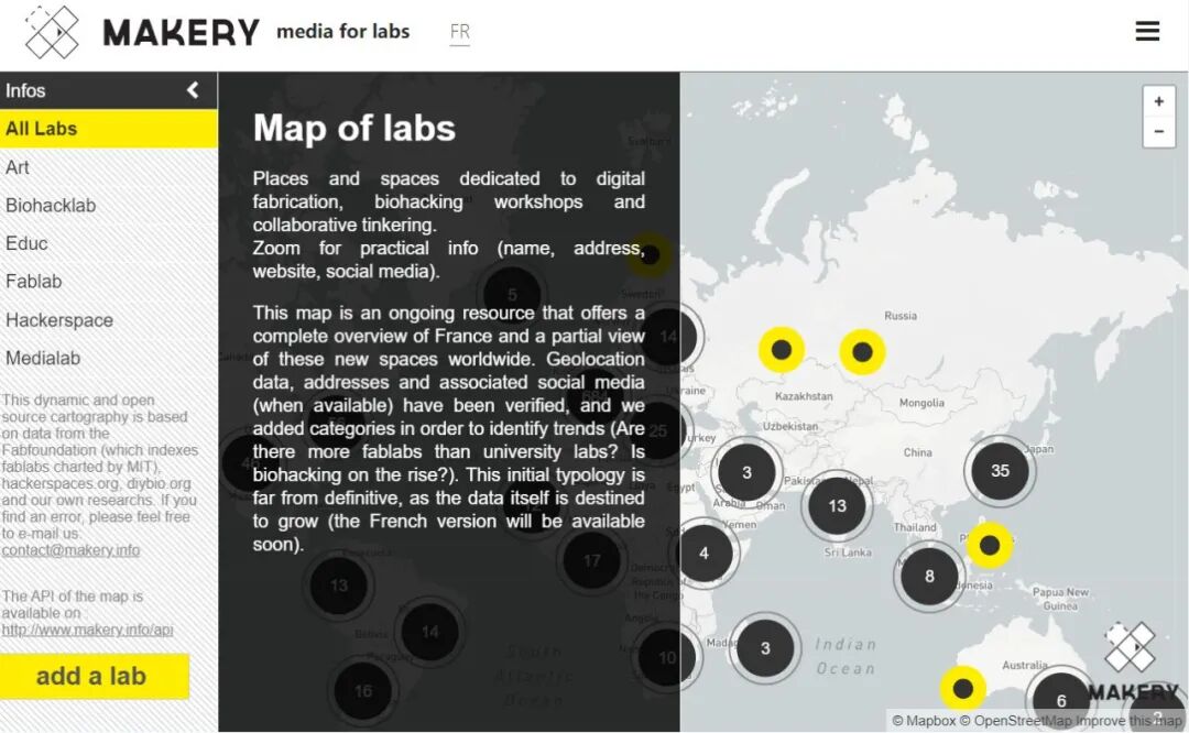 Map of labs,一个收录创客空间、创意工作坊、媒体艺术实验室等实践型实验室的地图。https://www.makery.info/en/map-labs/